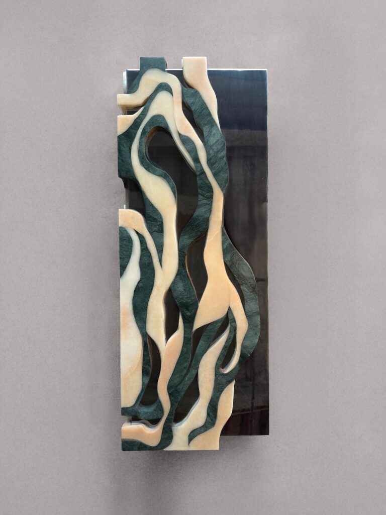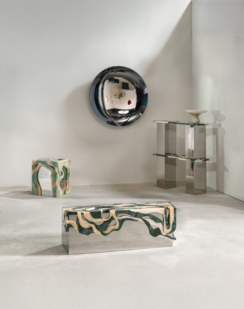 À la croisée de l’art, du design et de la sculpture, HOMA traite la matière comme un sujet vivant. Verre, marbre, miroirs, métaux naturels dialoguent dans un équilibre subtil entre transparence et densité. La collection Orbis incarne cette idée de transformation : du marbre recyclé renaît autour d’un fond réfléchissant. La pierre semble figée dans un mouvement de propagation, comme suspendue dans le temps.