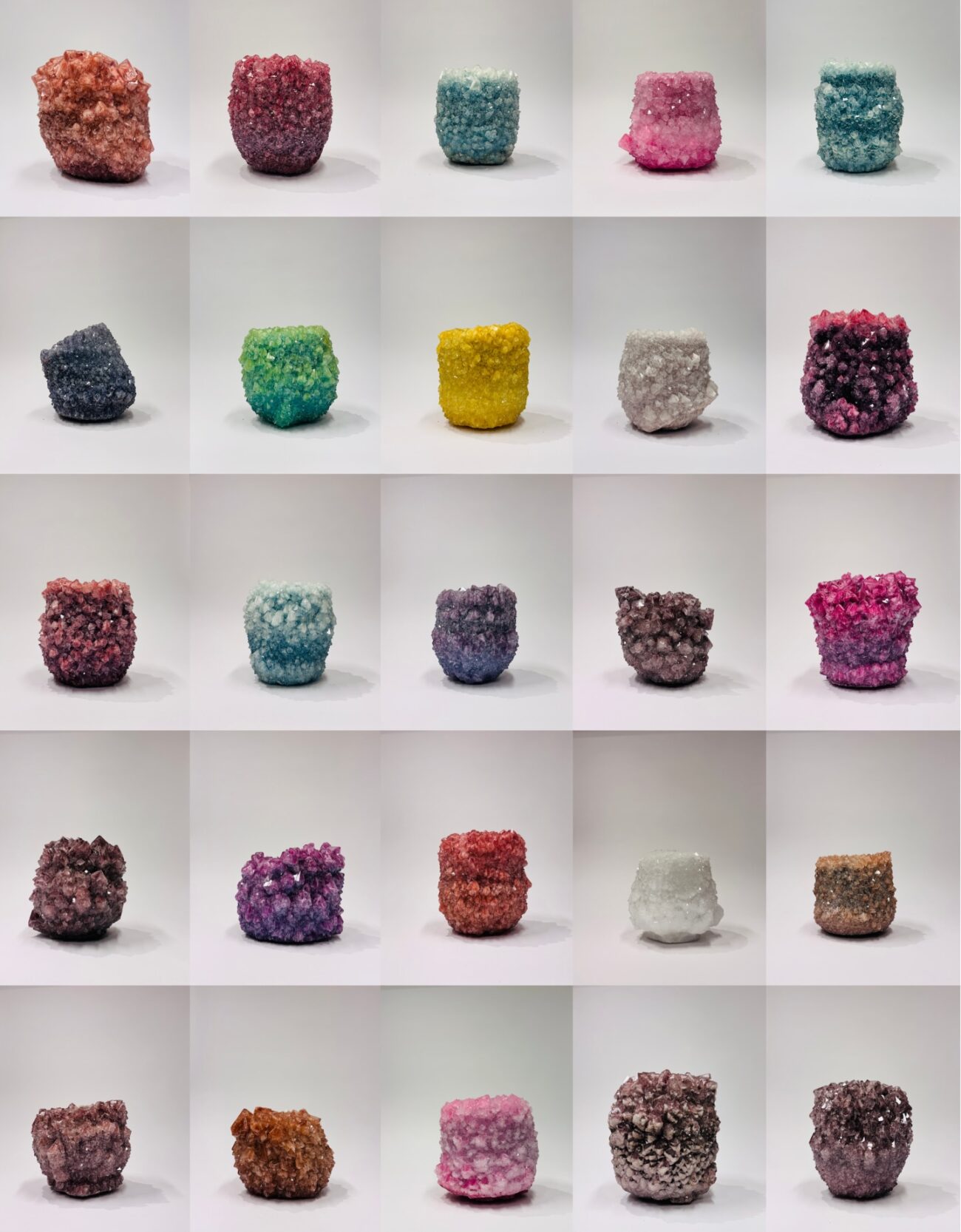 Mineral Series ne façonne pas, elle laisse advenir. Cristaux, minéraux et oxydes se développent lentement autour d’objets immergés, sans colle ni artifices. Chaque pièce est le résultat d’un temps incompressible, celui de la cristallisation. Dans une société accélérée, ces objets rappellent que la nature impose toujours son propre rythme. Le designer ne domine pas, mais accompagne le processus qui deviendra la forme.
