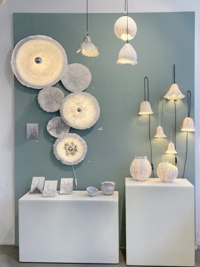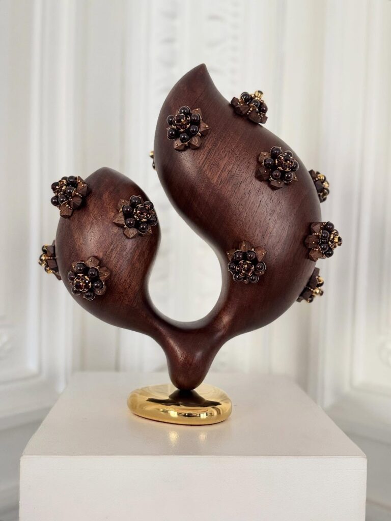 Ses pièces convoquent des imaginaires féminins, organiques, parfois marins. Elles transforment l’espace intérieur en un lieu sensible, presque narratif.
