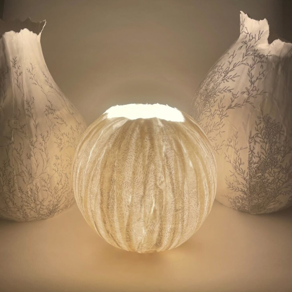 Papier, lumière, motifs floraux dessinés à l’encre. Les créations de Nathanaëlle Lobjoy célèbrent la délicatesse. Chaque luminaire devient un paysage végétal suspendu. Un design à la fois unique et intemporel, où la fragilité devient force.