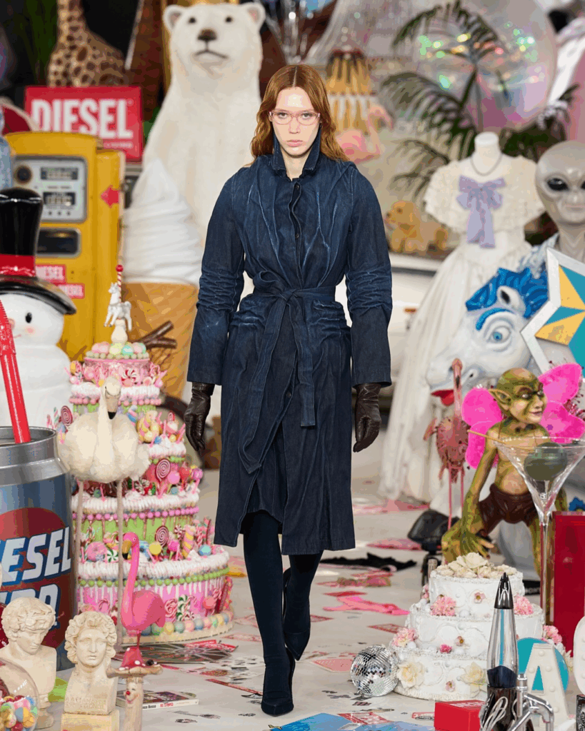 Glenn Martens, pour Diesel, transforme le runway en une installation digne d’une biennale d’art contemporain. En utilisant 50 000 mementos et archives pour saturer l’espace, Diesel refuse l’amnésie de la mode et revalorise le « déjà-là ». Le passé n’est plus une narration linéaire ou nostalgique, c’est un gisement de matières à réemployer.