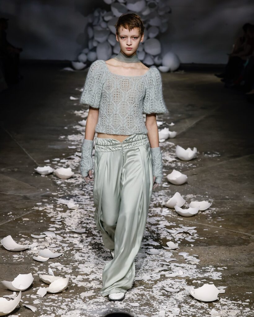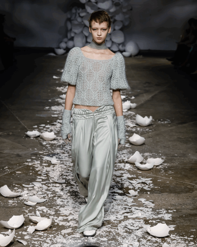 Pauline Dujancourt pousse l’expérience jusqu’à l’écoute du geste. En jonchant le sol de fragments de « coquilles d’œufs », la marque force le spectateur à prêter attention au poids d’un pas. Le mouvement banal de la marche devient un événement sonore et fragile.