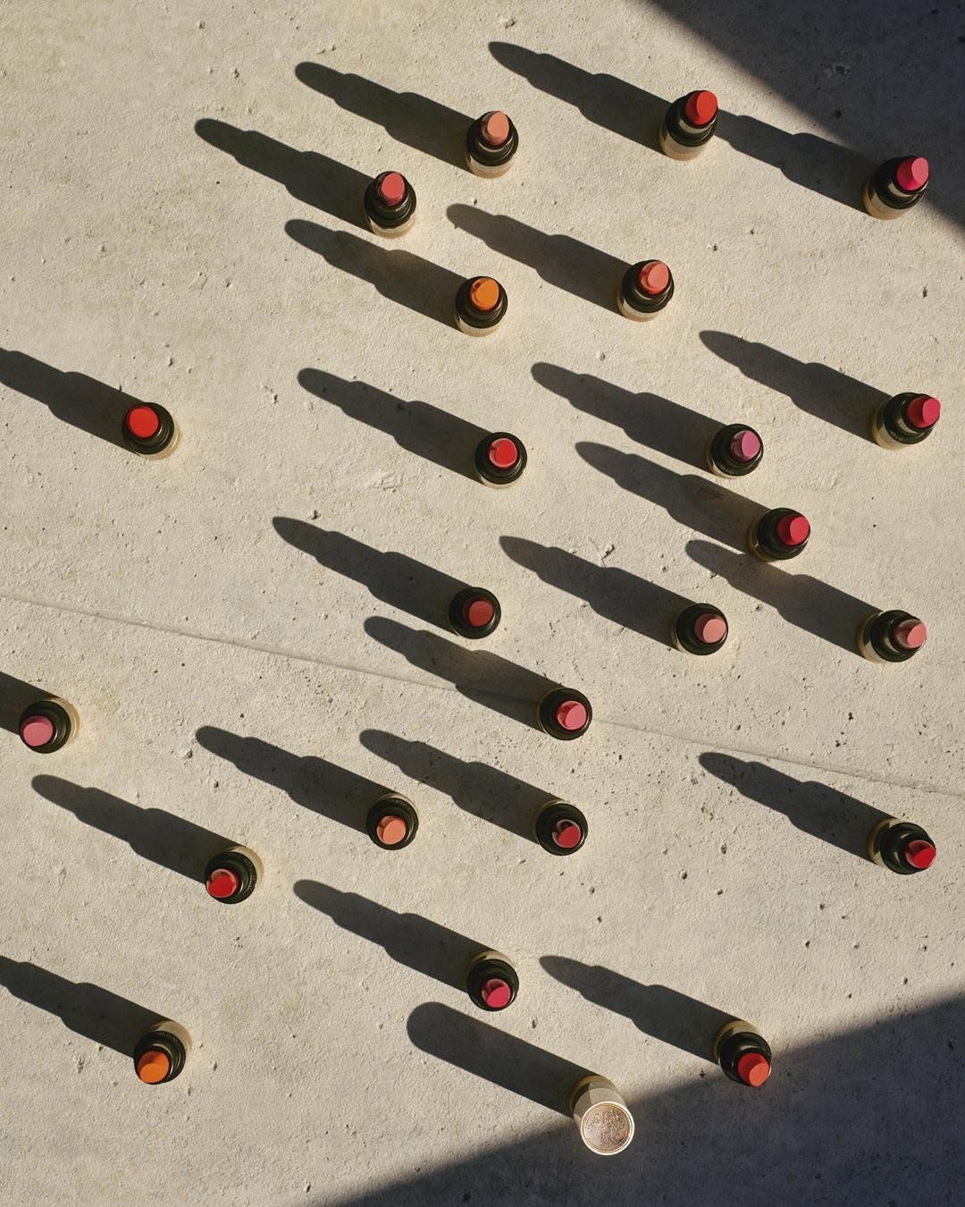 Chacune des 55 teintes — 27 satinées, 28 mates —, méticuleusement choisie par elle, se veut universellement flatteuse. Sous une pigmentation intense, la formule enrichie en cires naturelles, en beurre de karité et en acide hyaluronique garantit tenue et confort. Tout comme les 10 baumes qui se présentent comme une garde-robe plus discrète qui nourrira les lèvres tout en les sublimant. Quant aux 8 harmonies d’ombres à paupières, elles rassemblent chacune 4 teintes sous un même boîtier : trois tons portables au quotidien, flanqués d’une nuance plus inattendue.